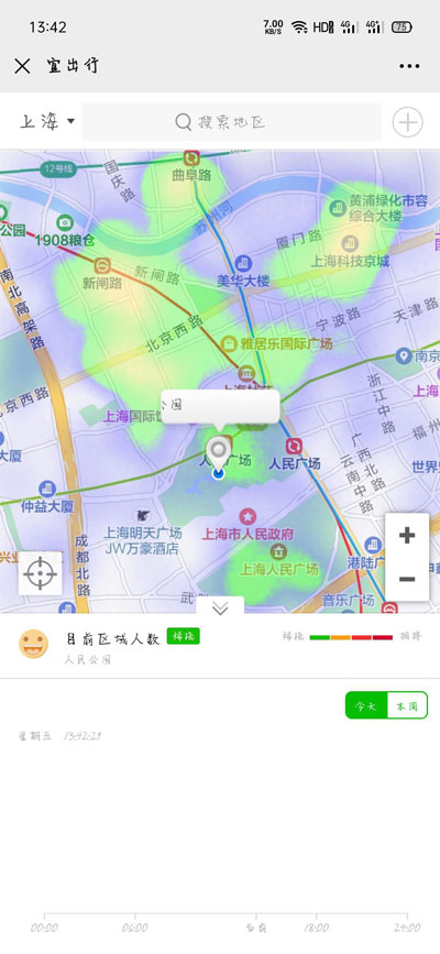 5、自动跳转到宜出行页面,上下滑动就能看到当前地图的热力图了,根据下方的颜色指示看出当前位置的人群数量情况。