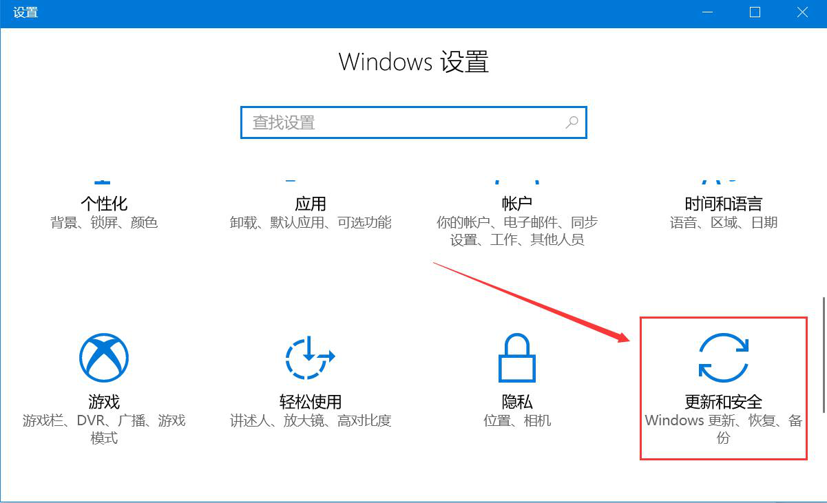 4、卸载完成,通过组合键“Win+I”进入win10的系统设置,从中点击“更新和安全”。