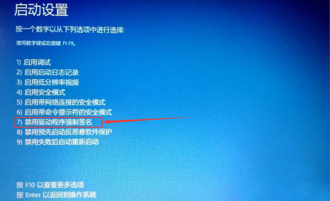 6、当电脑重启之后,进入启动设置,按键盘7键进入“禁止驱动程序强制签名”模式。