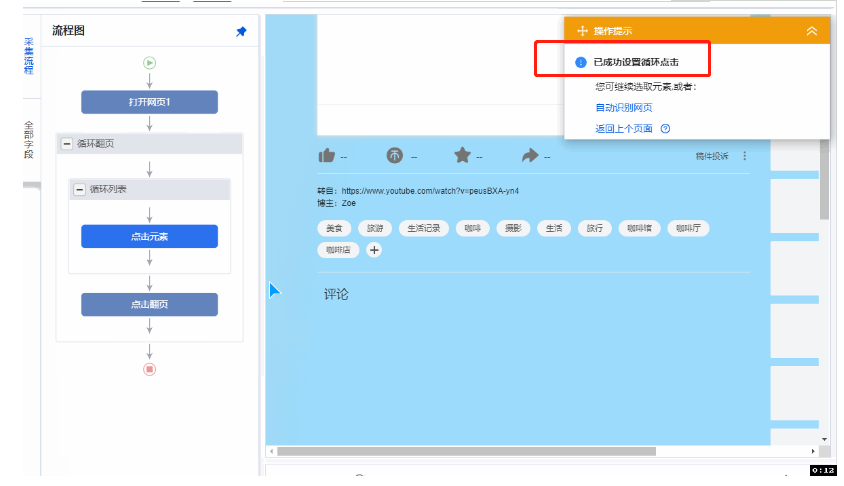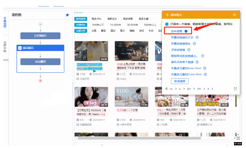 7、在新出现操作提示列表中点击【循环点击每个链接】,八爪鱼就会从第1个视频的详情页开始依次进入全部选中视频的详情页,并分别采集每个视频具体数据,
