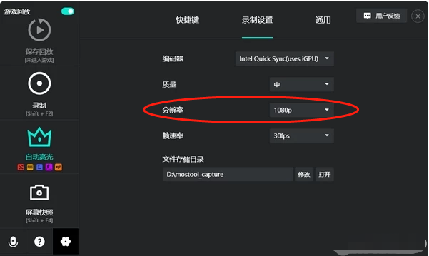 3、第二个是质量。点击质量右侧对应的倒三角图标,降低录制视频的画面质量级别,最好设置为中,如果卡顿非常严重的话,可以尝试设置为低,不过这样录制出来视频看起来比较费劲,慎选!
