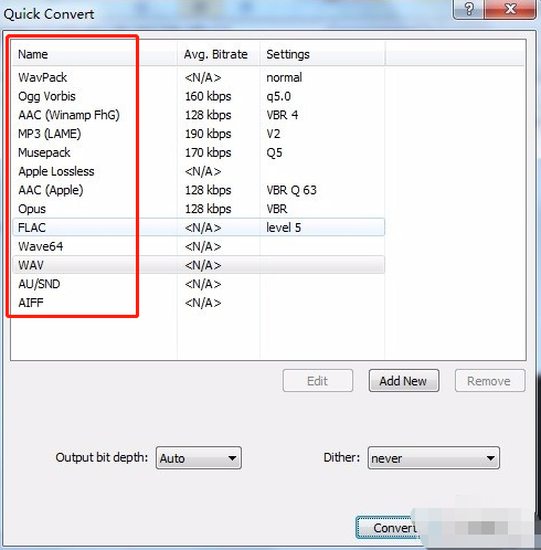 5、弹出快速转换窗口,在该窗口中可以选择需要转换的歌曲格式,Foobar2000支持MP3、WAV、Ogg、FLAC等多种格式,选好之后,点击窗口右下方【convert】。