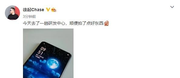 9月23日,realme副总裁徐起又为网友曝光了新品的一些消息,他发微博称“今天去了一趟研发中心,顺便拍了点好东西”,配图是一张手机的照片。从配图来看,新机采用了真全面屏的设计,屏幕左上角、右上角以及中间均没有开孔,可能是升降式全面屏或者屏下镜头的设计,引发了广大网友的热议。在评论中,徐起否认了升降式全面屏的设计,由此来看,屏下镜头设计无疑。从实拍图来看,黑色背景下屏下镜头隐藏的很好,不知道白色背景下会不会同样出色。