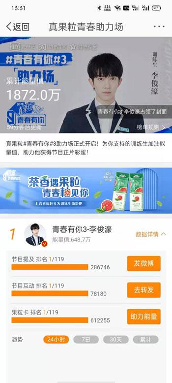 2、也可以在本文的最上方找到微博投票链接,点击进入“真果粒青春助力场”;