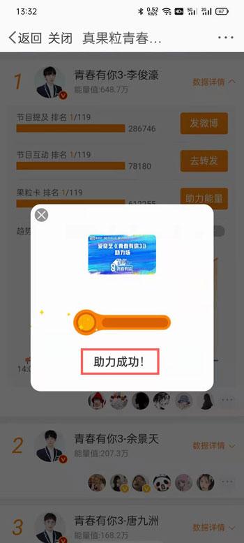 3、下滑找到想要投票的练习生,点击右侧的【数据详情】展开,点击【助力能量】;