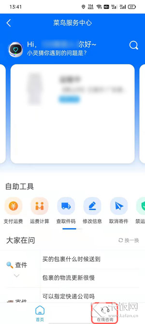 1、打开手机上的菜鸟app(原名菜鸟裹裹),在【我的】页面找到【服务中心】;
