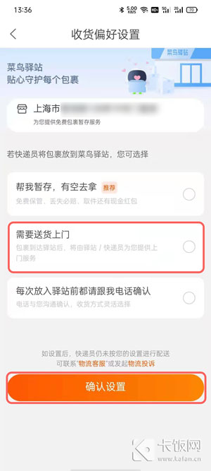 5、选择【需要送货上门】选项,点击【保存设置】,可避免快递被存放在菜鸟驿站中;