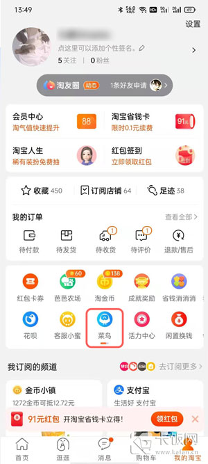 6、打开手机淘宝app,在【我的淘宝】页面,找到【菜鸟】服务;