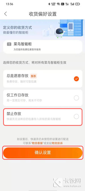 10、同样的,为了避免快递员将快递存放在菜鸟智能柜中,也可以一并选择设置,将其改为【禁止存放】即可。
