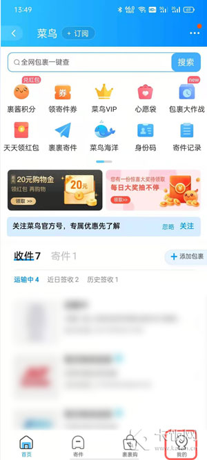 1、打开手机上的菜鸟app(菜鸟裹裹app),在【我的】页面点击【服务中心】;