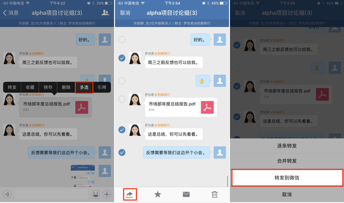 另外,你也可以将企业微信消息转发到个人微信,如图,长按消息,点击“多选”,再点击左下方的转发按钮,选择“转发到微信”即可。