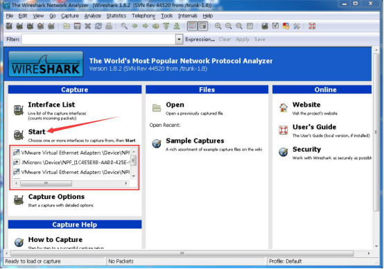 1. 首先,我们进入 wireshark 的向导界面。在网卡列表中选择需要抓包的网卡,再点击“Start”按钮,wireshark 便开始执行对该网卡抓包数据的指令。
