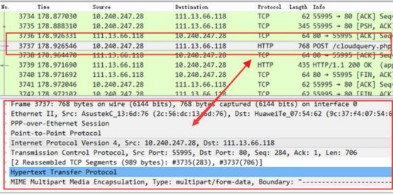 4. 当我们在封包列表中任意点击一项数据包的时候,它的颜色显示会跟其他的不一样。而且还会展示该数据包的详细信息,如下图所示。