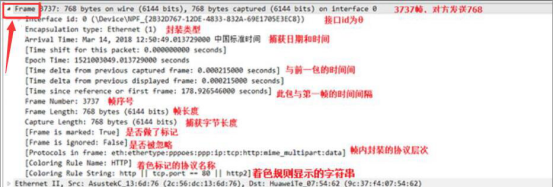 5. 接下来,跟大家说说怎么看 wireshark 抓包数据的详细信息。在上图中就可以看到每一项信息的左侧都会有一个“>”符号。当点击它的时候,就会具体展示该信息项的信息了。比如说“Frame”,它是数据包的物理层,可以从中看到帧数、封装类型等等。