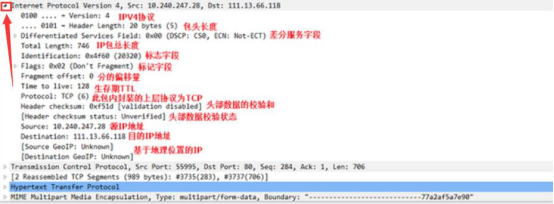 7. 而点击展开“Internet Protocol Version”,可以看到 IP 数据包总长度,头部数据的校验状态等等。