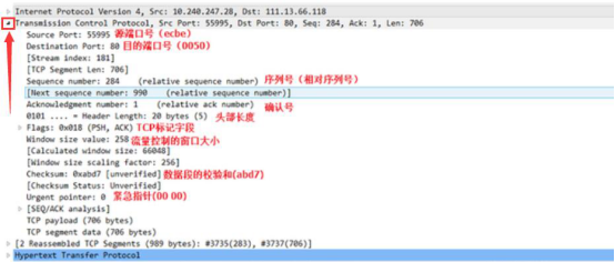 8. 同样的,再点击展开“Transmission Control Protocol”的时候,就可以看到端口号、序列号等等。