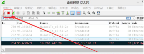 9. 最后,如果用户不需要 wireshark 继续抓包,就点击 wireshark 左上方的红色“停止”按钮即可结束抓包。