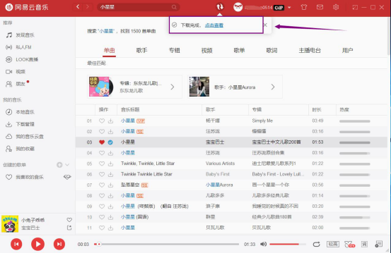 5. 当歌曲下载完成了,网易云音乐的顶部会有相关的提示,如下图。