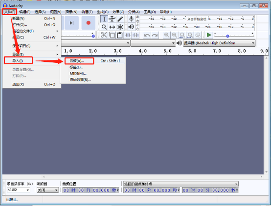 1. 打开 Audacity 软件,依次点击“文件”->“导入”->“音频”。