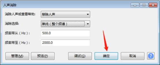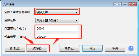 5. 弹出人声消除窗口,选择“移除人声”,其他默认,然后点击“预览”试听选定的片段,根据试听效果随时调整频率带从和频率带至,注意保持在 300-3000 Hz 范围内。