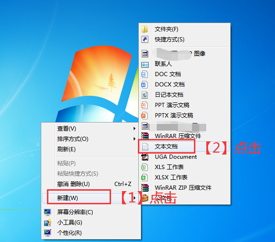3. 鼠标右击桌面,弹出菜单,点击“新建”->“文本文档”,如图所示
