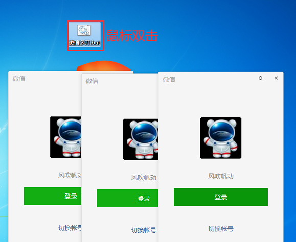 8. 最后使用鼠标双击这个 .bat 文件,就会自动打开多个微信登录界面,输入账号进行登录即可。