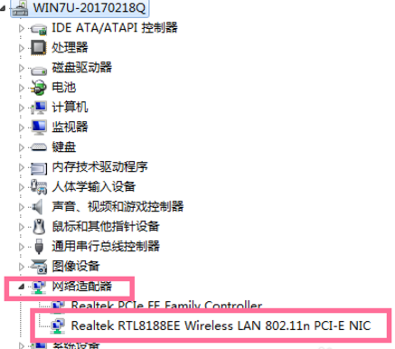 3. 然后点击“网络适配器”,再点击自己的无线网卡(一般是带有 Wireless 或 WIFI 字样的)。