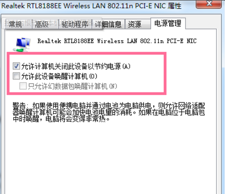 4. 在无线网卡属性编辑器里,点击“电源管理”,取消“允许计算机关闭此设备以节约电源”之前的复选框。这样设置完成后,WIFI 时有时无这种情况便基本上解决了。