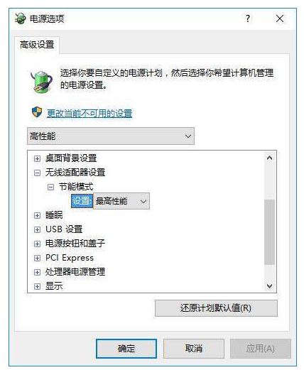 完成上述操作后,WiFi 不稳定的情况基本可以解决了,另外我们也可以将无线适配器的模式设置为“最高性能”。