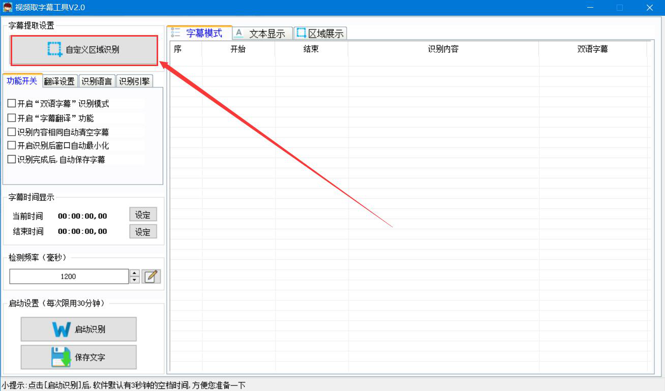 1. 首先,我们打开视频取字幕神器,点击界面左上方的“自定义区域识别”按钮。