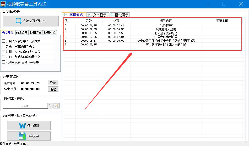 5. 我们可以在视频取字幕神器中看到该视频的字幕在不断地被提取,识别的内容越来越多,如下图所示。