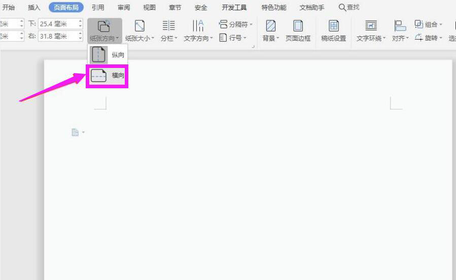 1. 首先,我们新建一个 word 文档。点击“页面布局”菜单中的“纸张方向”按钮,并将纸张方向设置为横向。