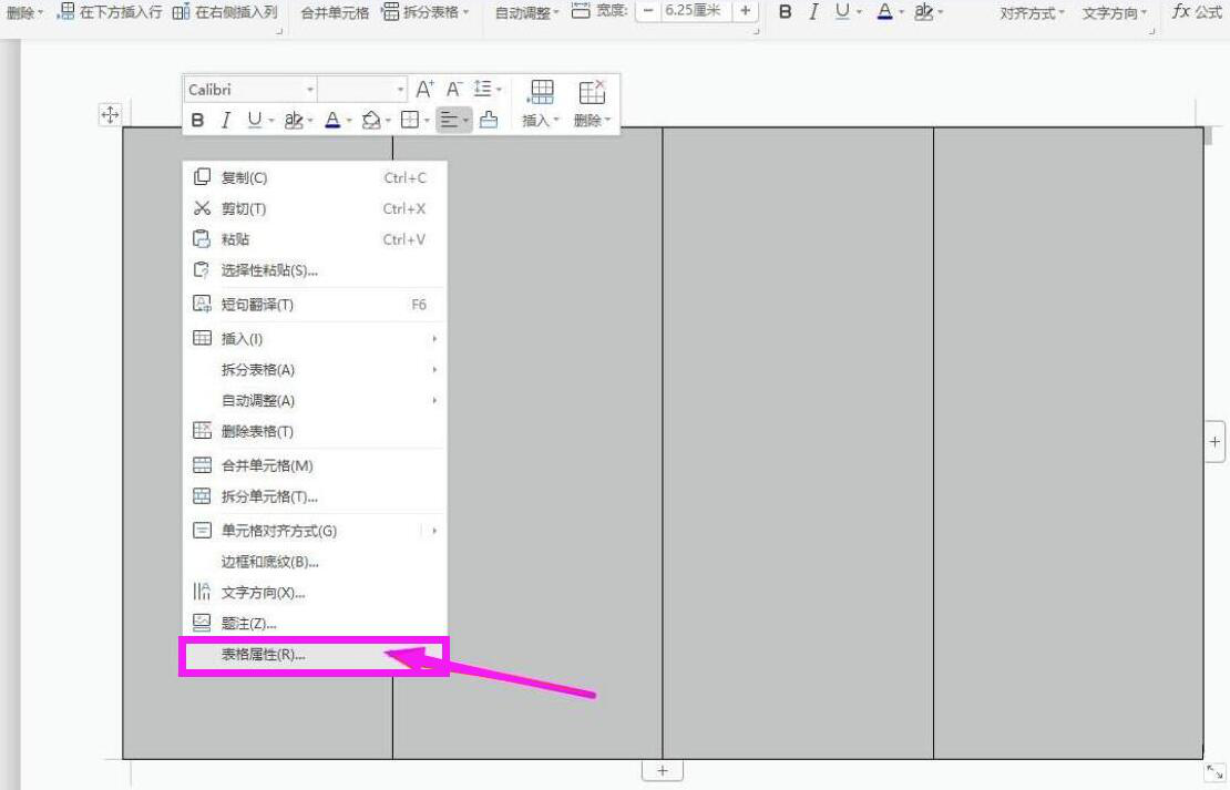 2. 然后,插入一行四列的表格。右键单击该表格,并在右键菜单中点击“表格属性”。