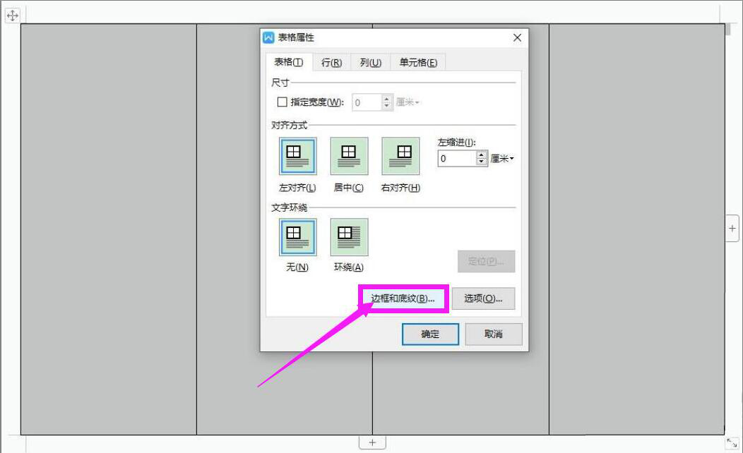 3. 进入表格属性窗口,点击“边框和底纹”。