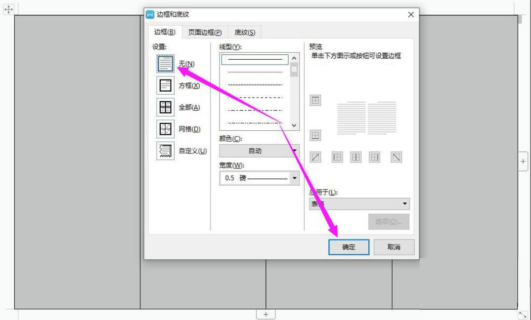 4. 在 word 的“边框和底纹”窗口中,我们设置“无”边框,再点击“确定”按钮。因为我们平时看到的双面席卡都是只有文字而没有边框的。