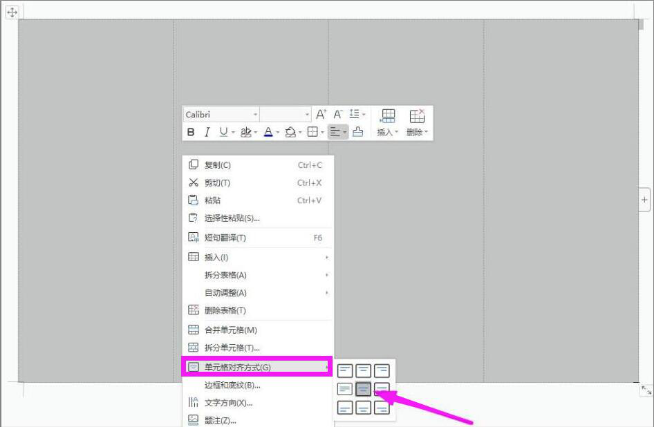 5. 为了 word 制作出来的双面席卡更加美观,我们再次右键单击整个表格,并在右键菜单中点击“单元格对齐方式”中的“垂直居中”。