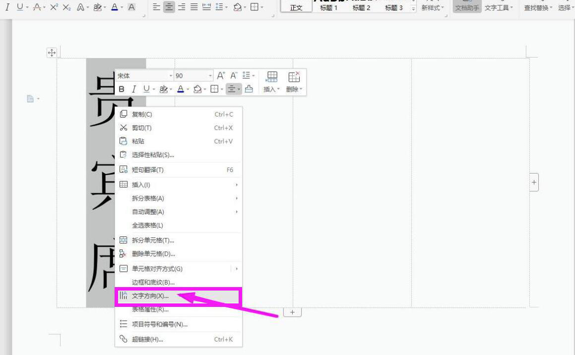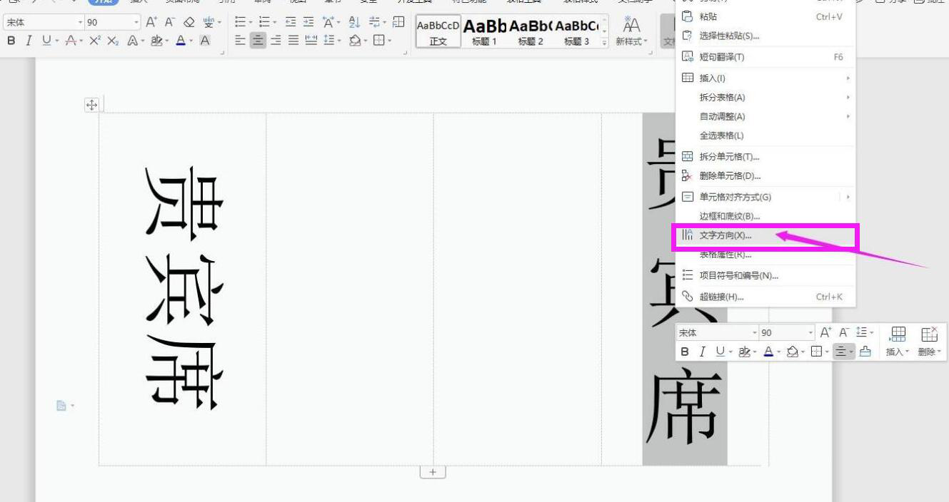 6. 接下来,我们在表格的第一列输入席卡第一面的参会者姓名,并且将字号变大,例如,这里我们将文字设置为 90 字号。之后,选中参会者姓名,右键单击它,点击“文字方向”。