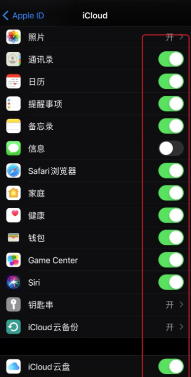 如图,找到“iCloud”菜单,继续下一步的操作,点击相关选项,选择开启,信息就会自动上传到当前账号,