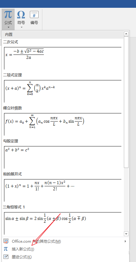 打开 Word 文档,如图,在菜单栏点击“插入”->“公式”->“插入新公式”,