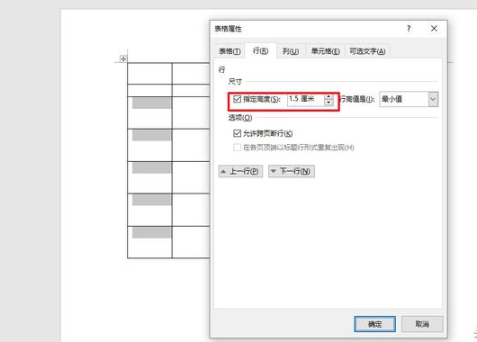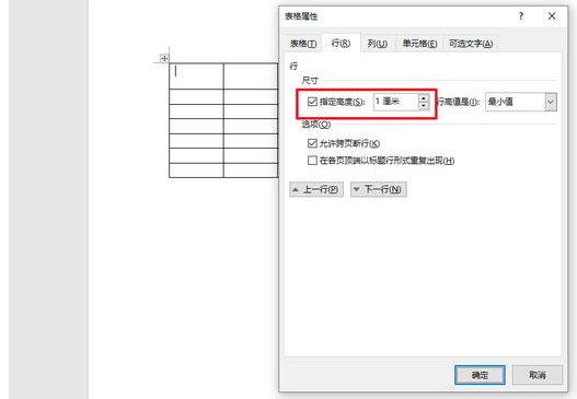 2. 鼠标定位在第一行,单击鼠标右键,选“表格属性”->“行”,在“尺寸”中将“指定高度”设为 1 厘米。