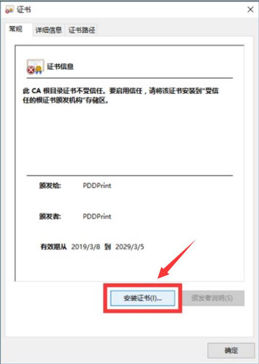 2. 然后,在拼多多打印组件证书的窗口中,点击“安装证书”的按钮。