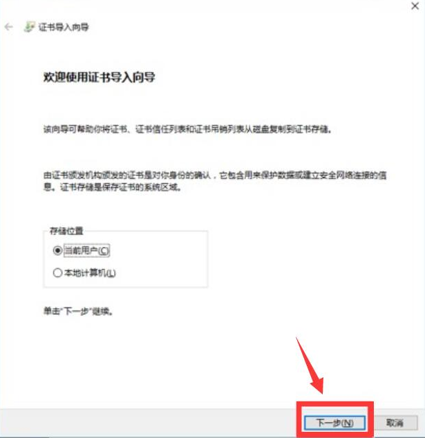 3. 接下来,在拼多多打印组件证书的导入向导页面中,勾选“当前用户”再点击“下一步”的按钮。