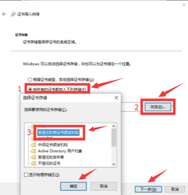 4. 随后,用户需要选择拼多多打印组件证书的存储位置。勾选“将所有的证书都放入下列存储”,点击“浏览”的按钮,并在弹出来的路径窗口中选择“受信任的根证书颁发机构”的文件夹,并点击“确定”按钮,从而进入下一步的操作。
