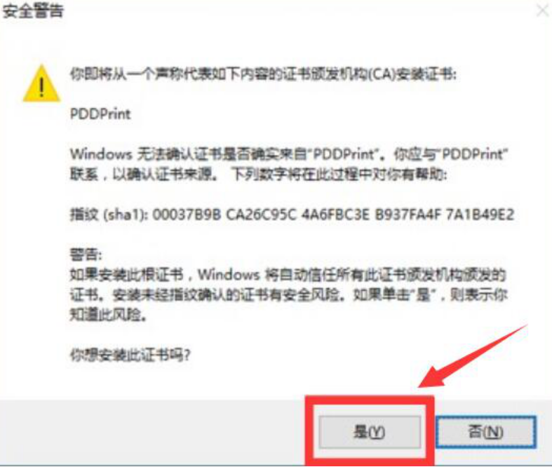 6. 最后,会出现安全警告,用户直接点击“是”的按钮,便完成拼多多打印组件证书的安装。