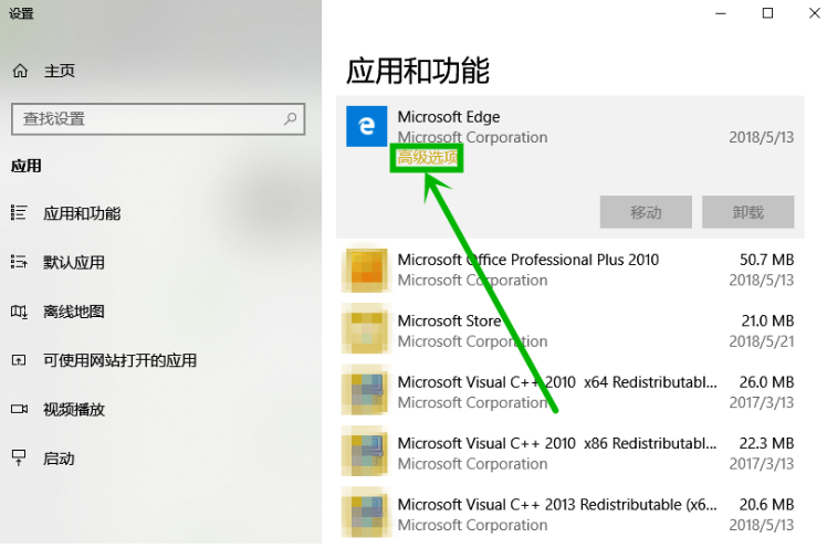 进入"应用和功能"界面,点击右侧的"Microsoft edge",然后选择"高级选项",
