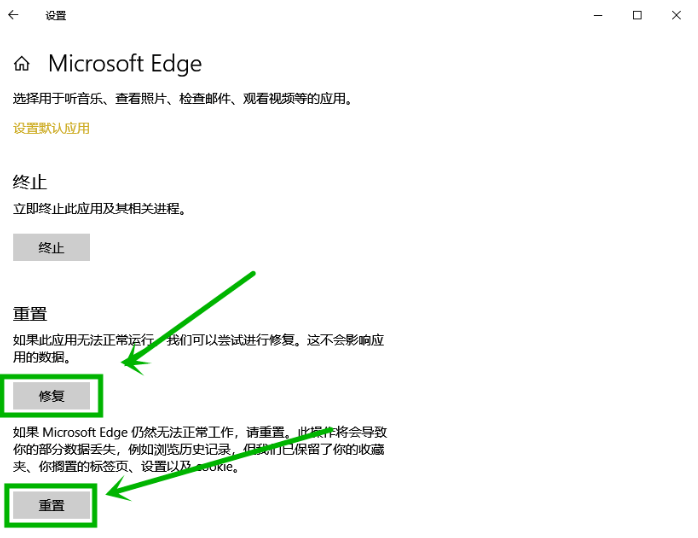 找到 edge 浏览器,右击选择"应用设置"选项,打开设置界面,进行相关的重置和修复操作,这里就略过了。