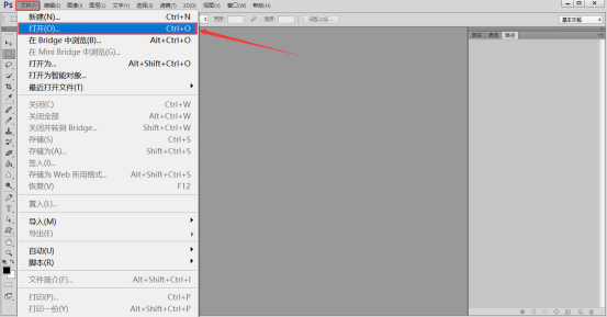 1. 首先,我们打开 PS。点击 PS 界面左上方"文件"菜单中的"打开",将需要扣取文字的图片导入 PS。
