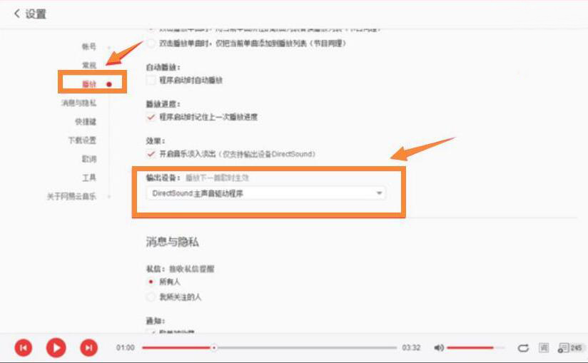 3. 在"输出设备"处,点击倒三角形的符号,选择正确的驱动程序后,将该软件重启,便可解决网易云音乐播放失败,提示切换输出设备的问题了。