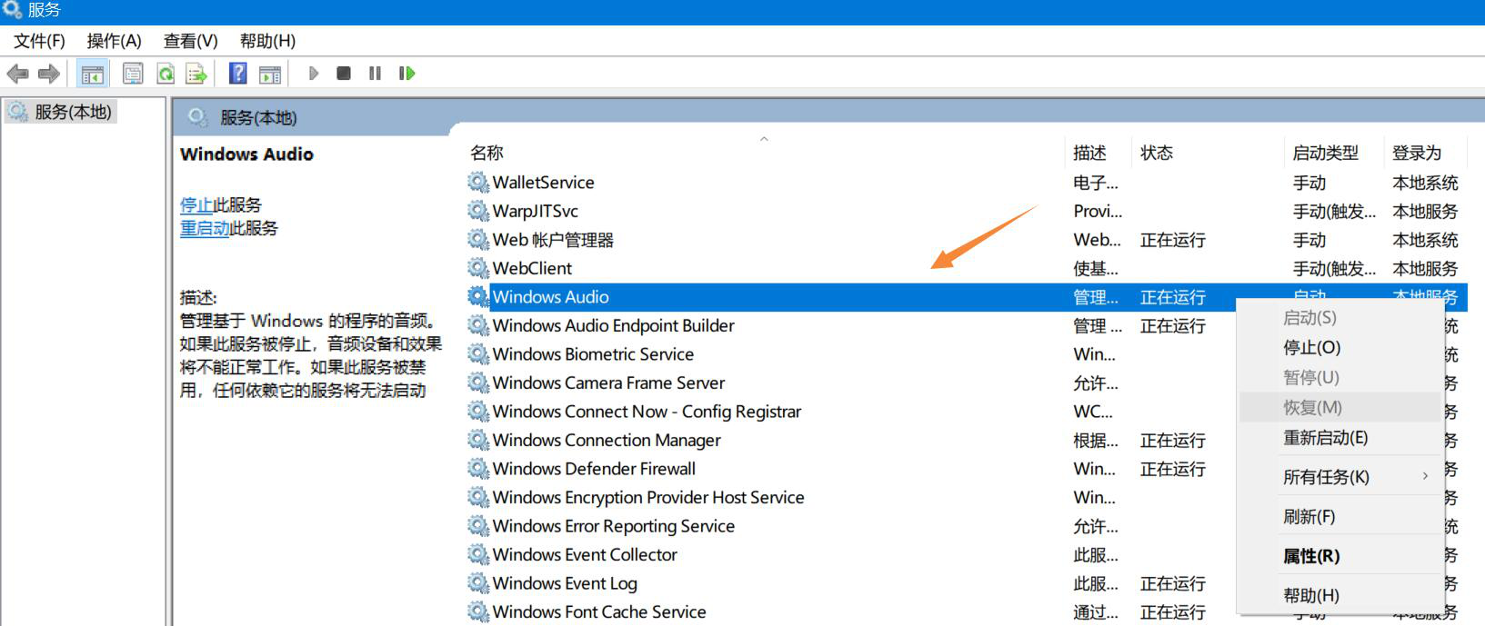 2. 在系统服务的界面列表中找到"Windows Audio",然后鼠标右击,在弹出来的菜单中点击"重新启动"。这样一来,也能解决网易云音乐播放失败的问题。