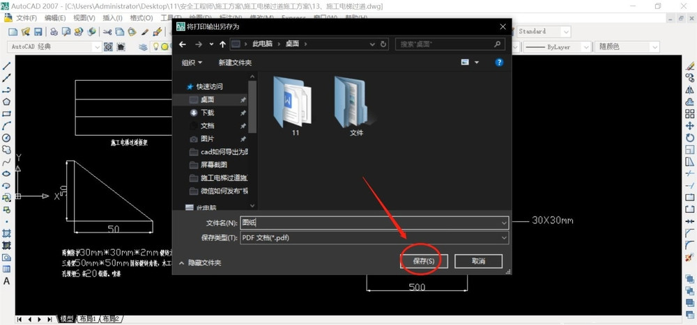 接着设置文件保存路径,如图,设置文件名、文件类型,点击"保存",即可将 CAD 图纸导出为 PDF 文件,